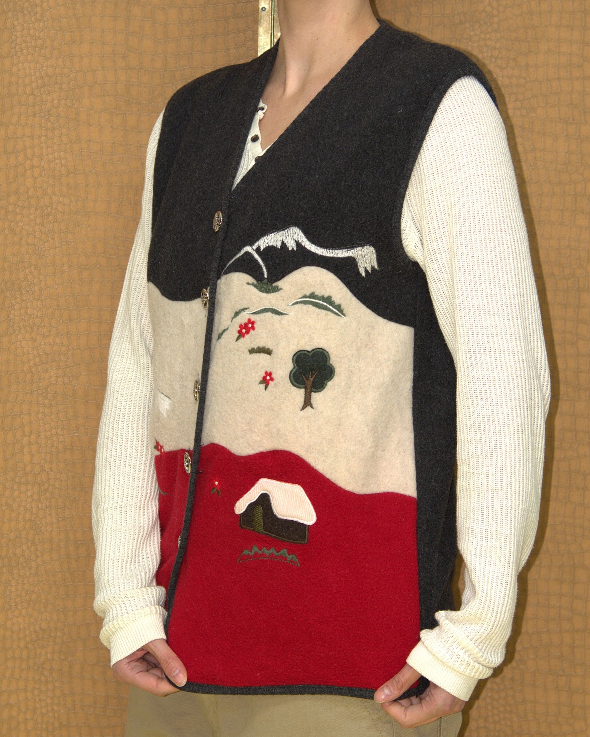 Leuk mouwloos gilett met een winters bergtafereel. Het gilet valt als een L.