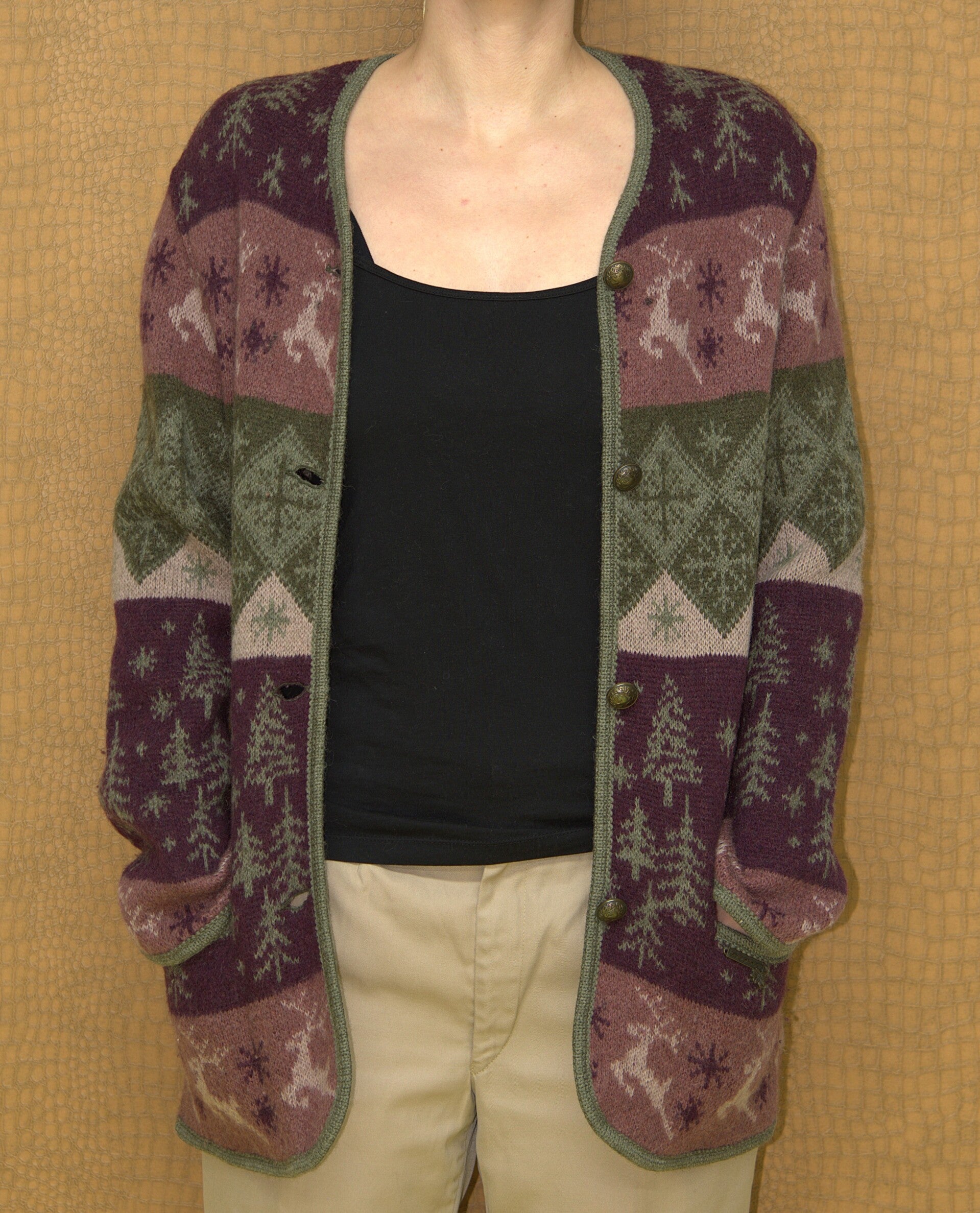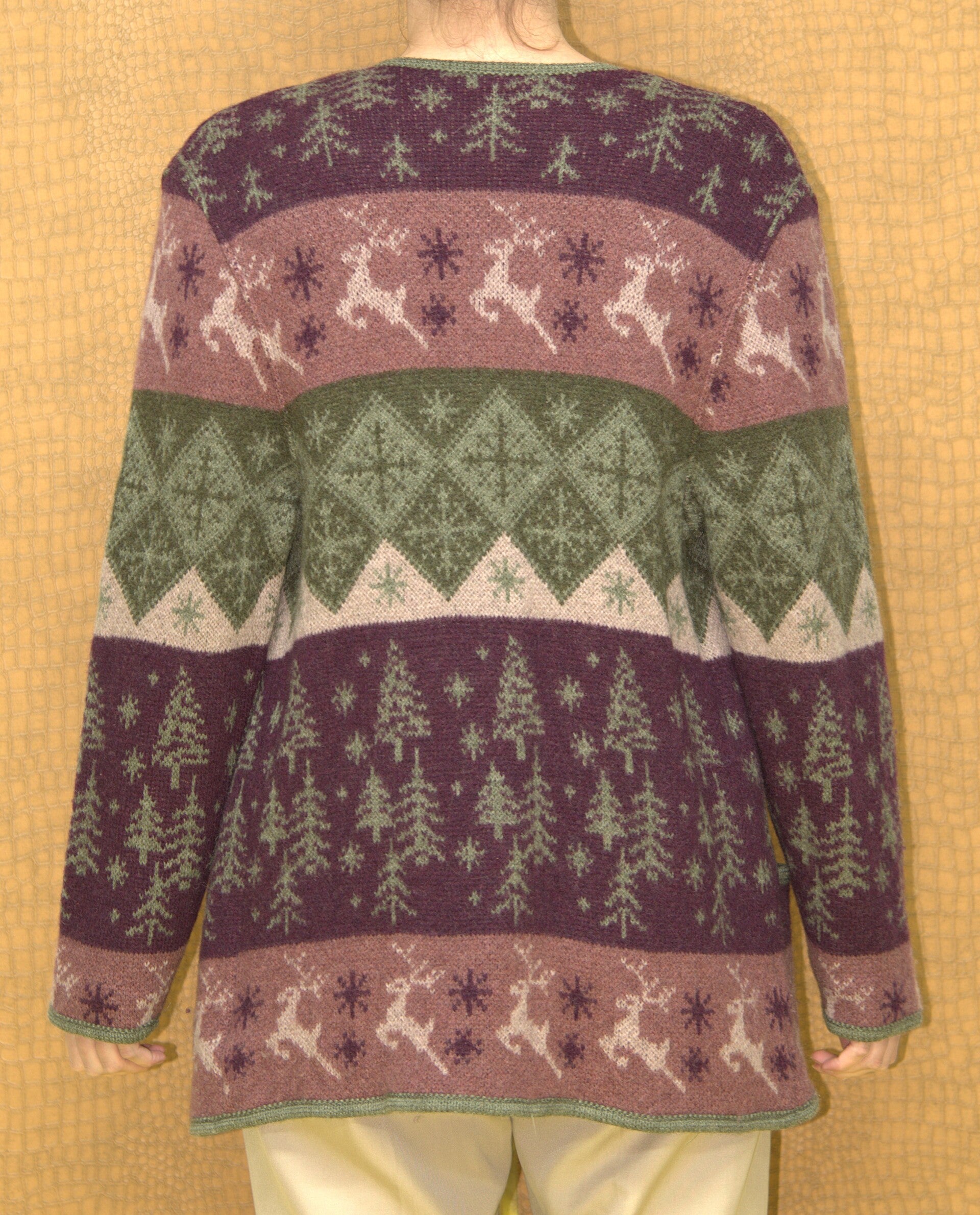 Paars/groen lang vest met allover print van sneeuwvlokken, dennenbomen en rendieren. Het vest heeft knopen en zakken en is van stevige kwaliteit. Het vest is een maat 40, echt vintage en in hele goede staat.