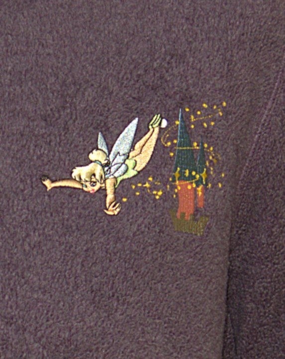Paars Tinkerbell fleecevest met applicaties op de linkerborst en mouw. Het vest is lekker warm en heeft een hoge sluiting bij de kraag. Gemaakt van rayon en polyester en de maat is een L
