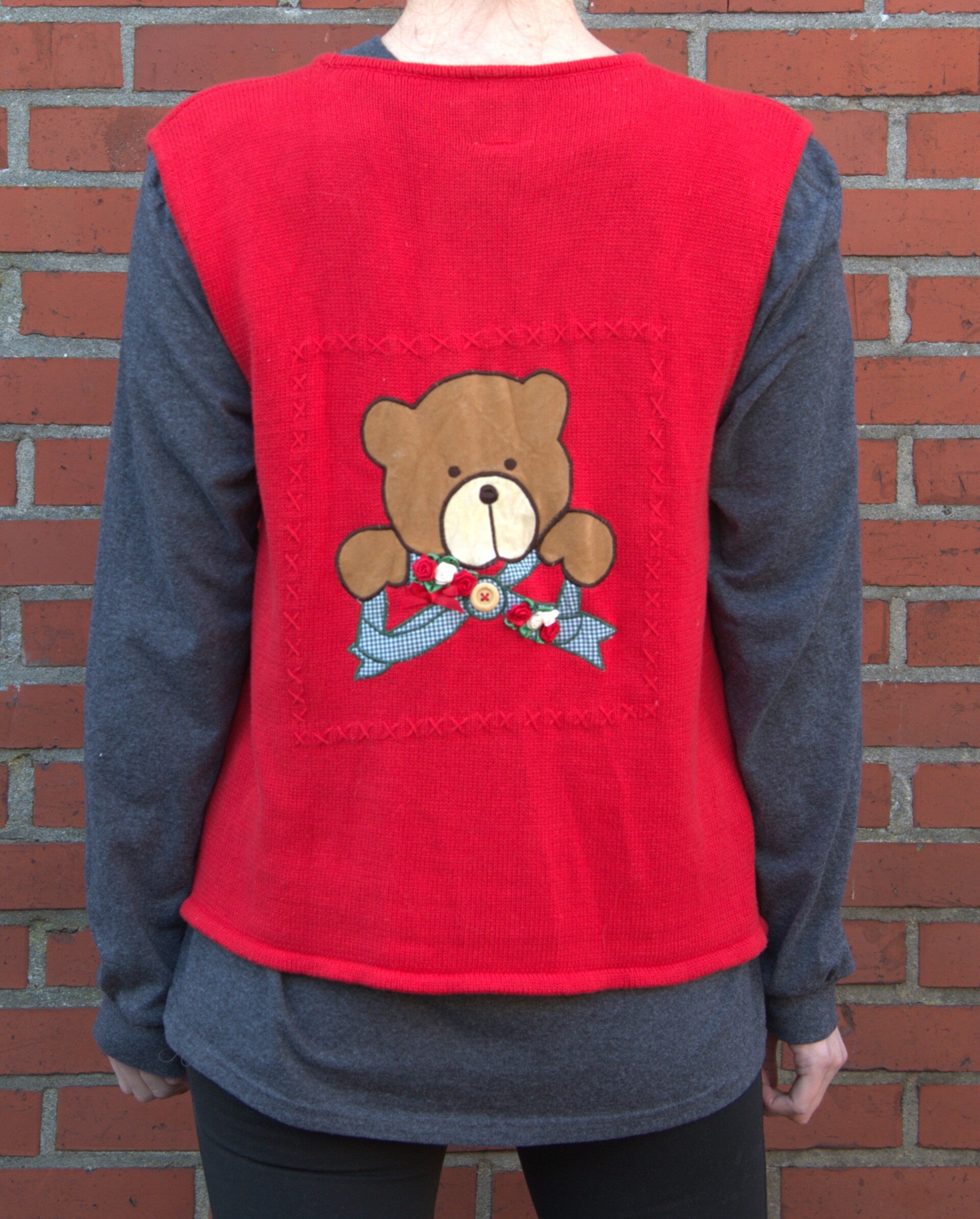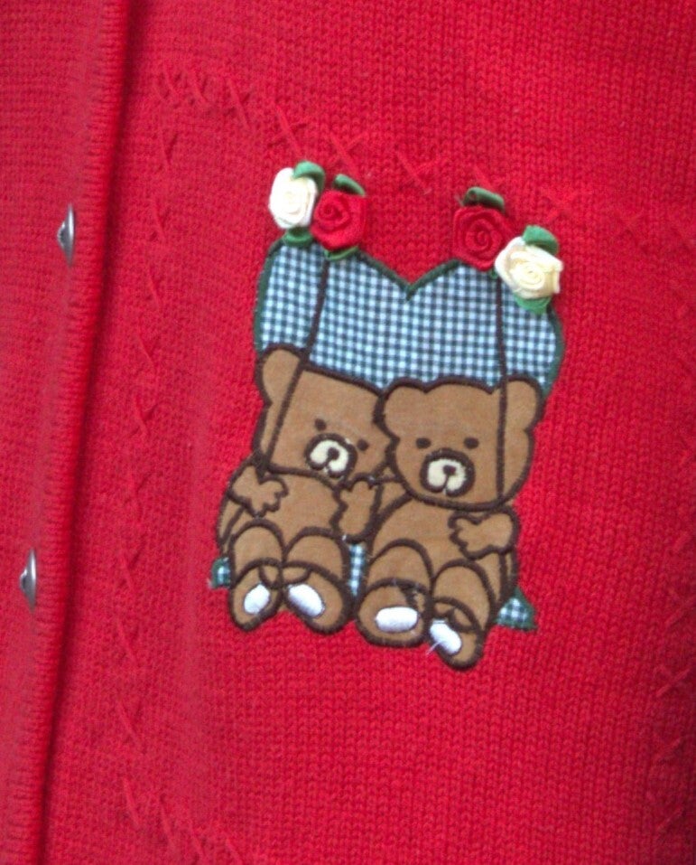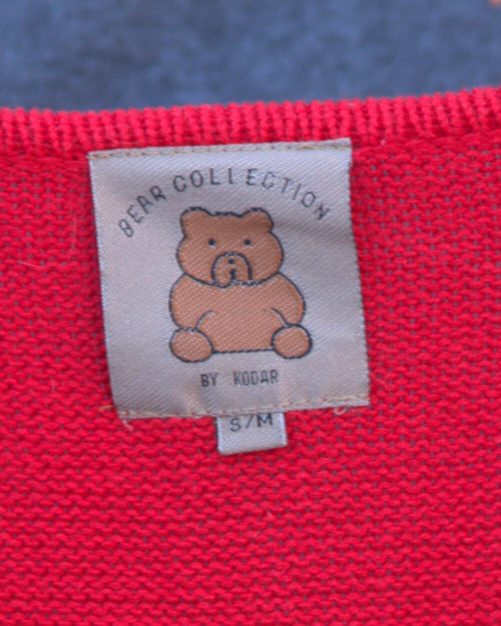 Het vest is van 100% katoen, heeft metalen knoopjes en lieve applicaties van beertjes. Het valt als een M en wacht op een liefdevol nieuw thuis.