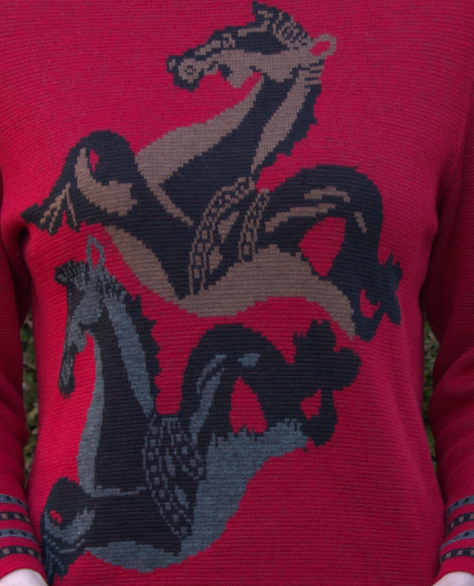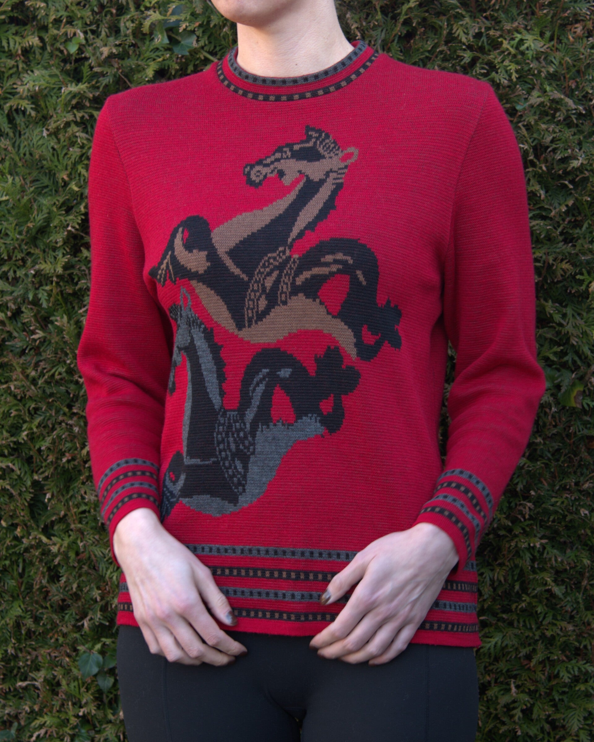 Unieke rode trui met abstracte carouselpaarden en decoratieve banen rond mouw, hals en heup. De trui is gemaakt in Frankrijk, is van wol en acryl en valt als een S.