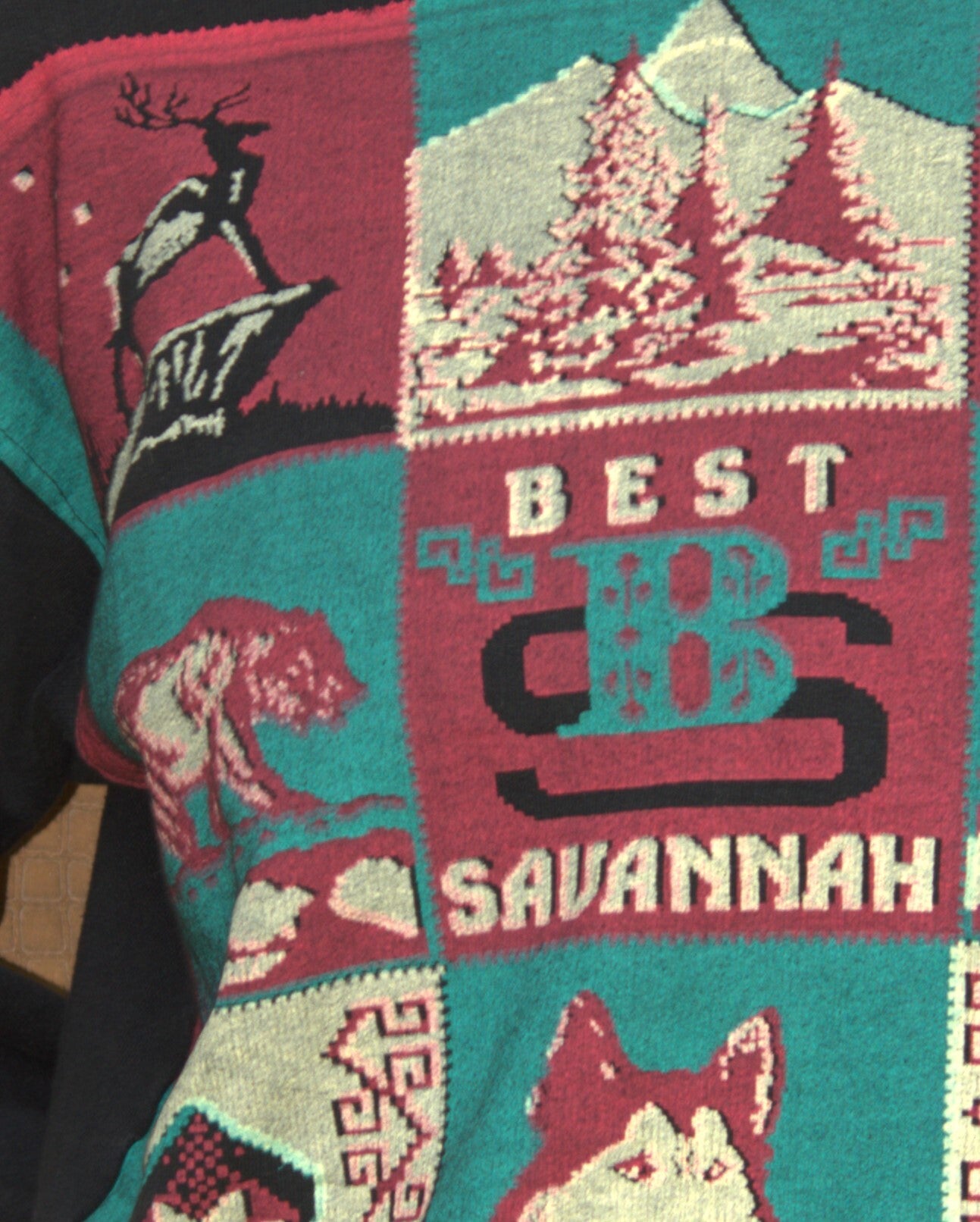 Opvallende sweater van Savannah, gemaakt van katoen en acryl. De trui komt uit de jaren 80 en is gemaakt in Griekenland. Leuk detail zijn de boordjes van de trui. De sweater valt als een S/M.