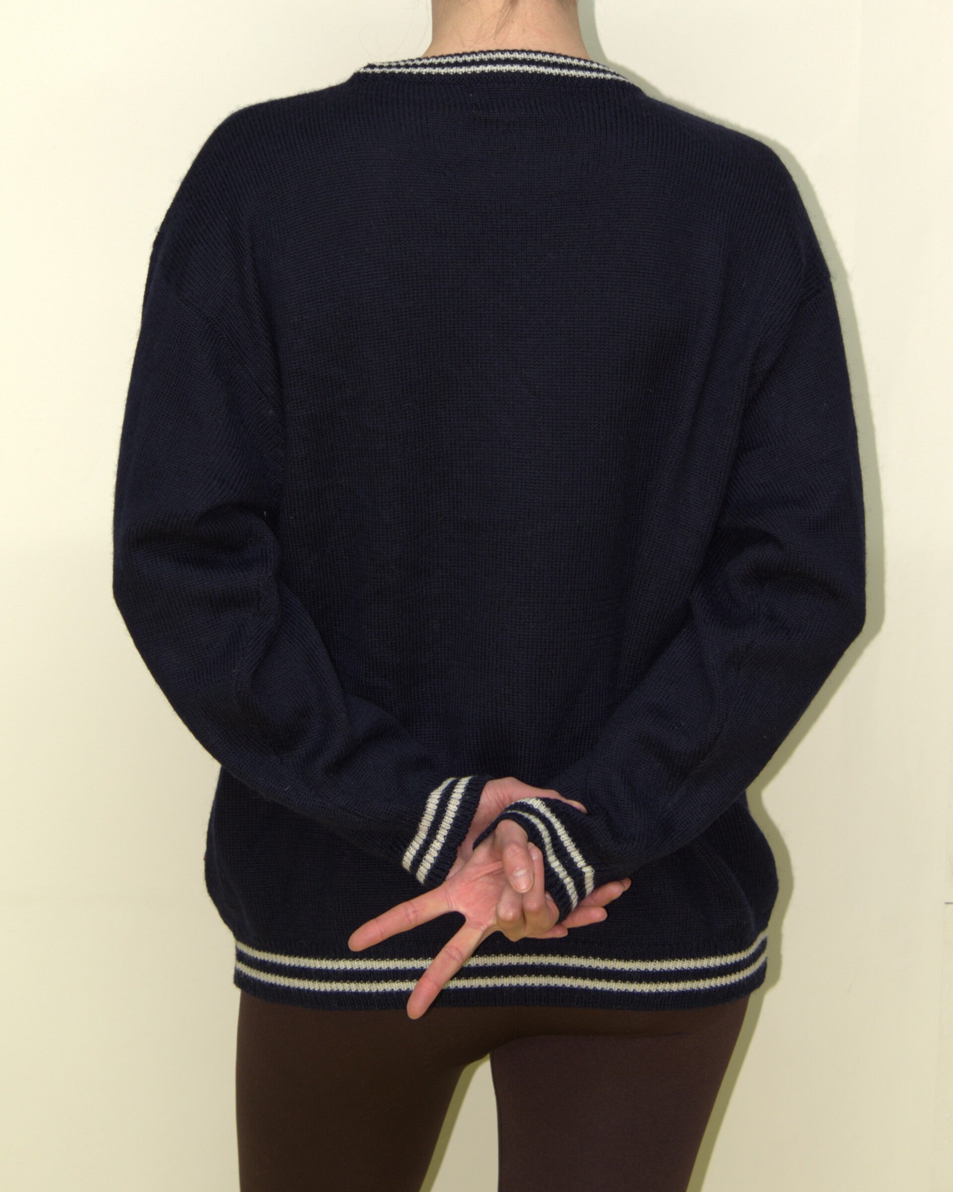 Hele mooie, donkerblauwe trui van Club Monaco. Lekker warm, door een wol/acryl combinatie. De trui valt als een M/L.