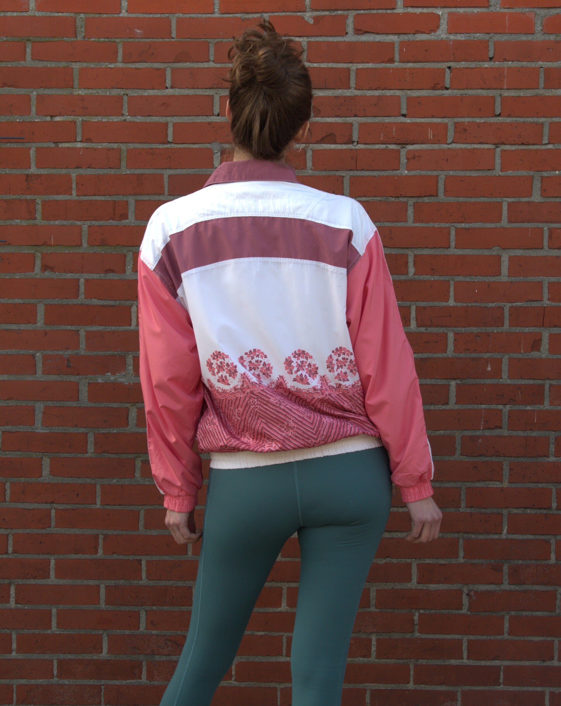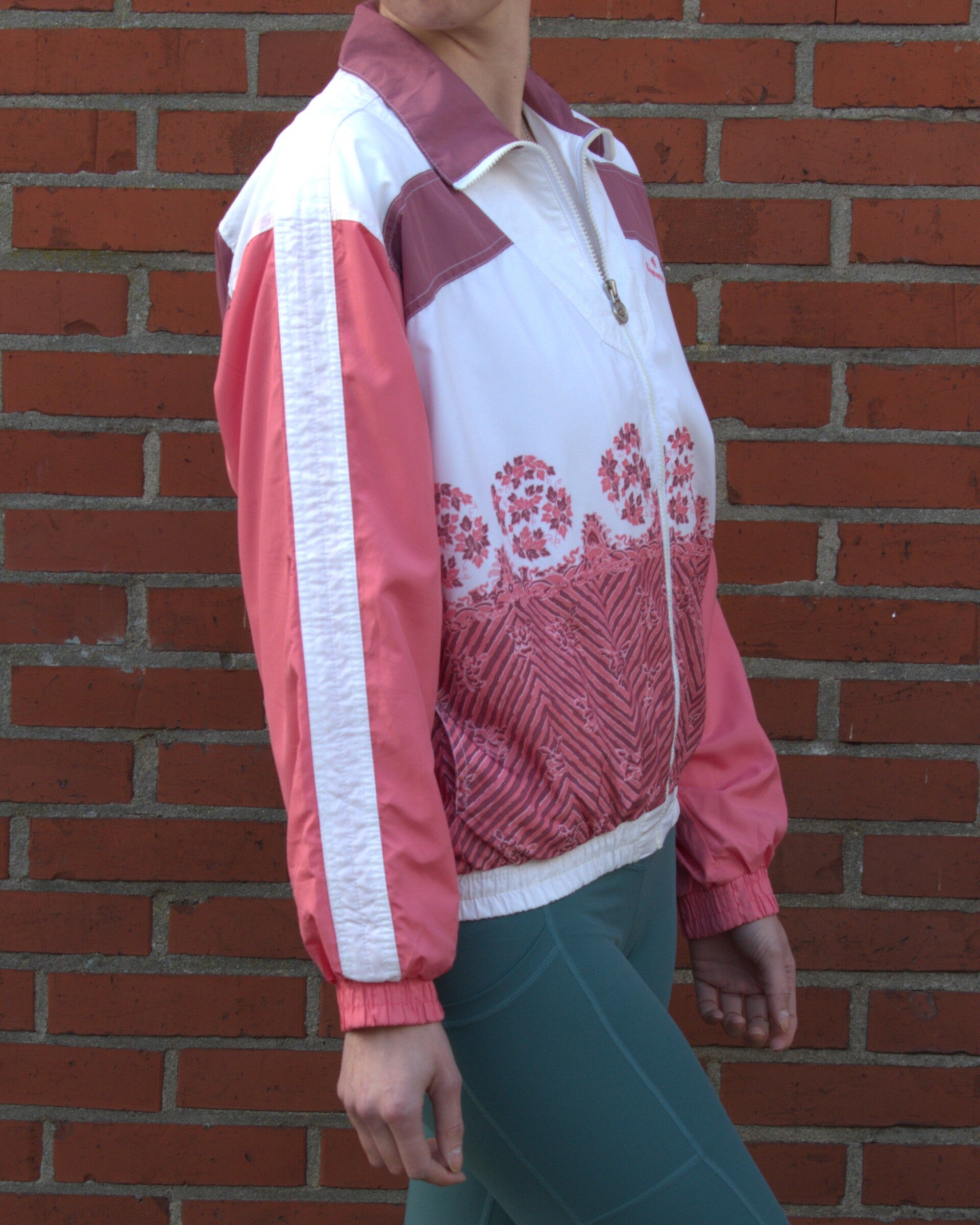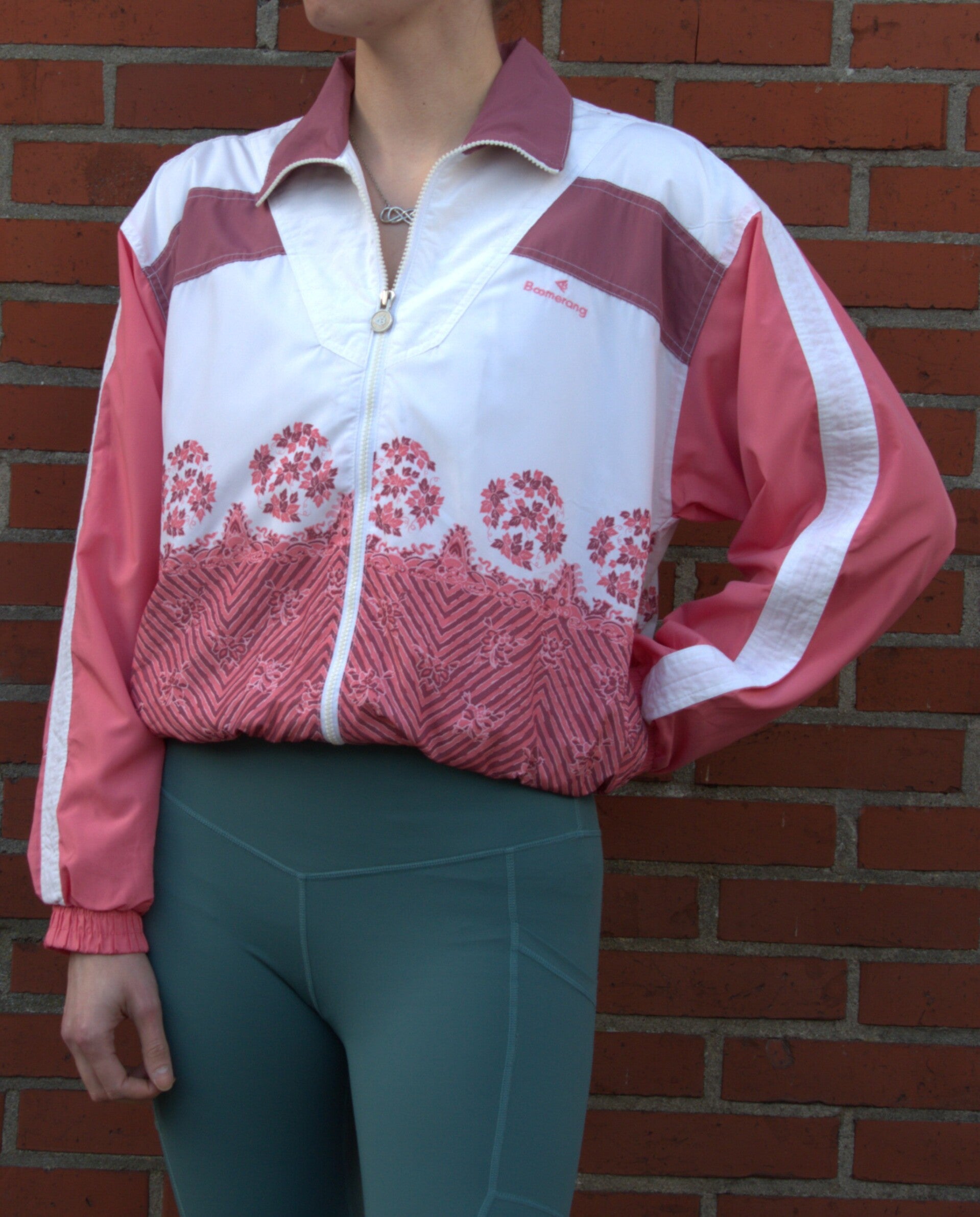 Voorjaarswindbreaker met fleurige print. Het jack is in uitstekende staat en is van 100% polyester. De heupband is dusdanig smal dat je hem ook op de taille kunt dragen. Valt als een S.