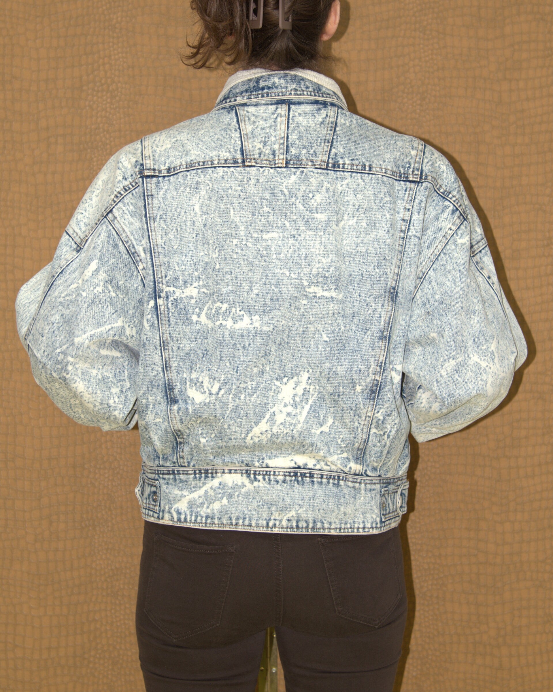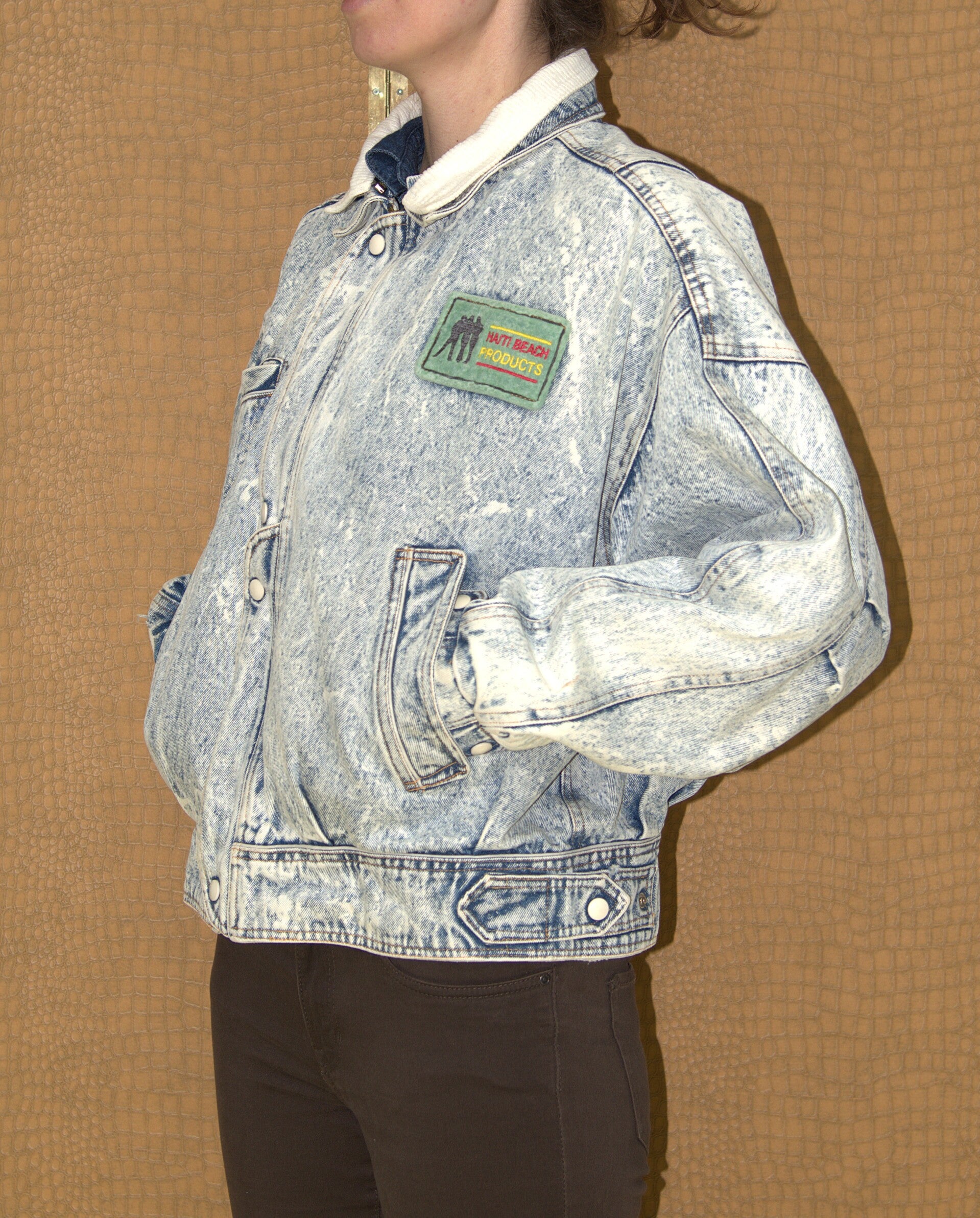 Een van de pronkstukken als het om acid wash vintage denim jassen gaat. Gemaakt in Frankrijk, zeer waarschijnlijk in de 80's. De witte kraag in afneembaar en dus makkelijk te wassen als er pruimtabak op geknoeid is. De rits doet het nog goed, maar niet meer zo soepel als 40 jaar geleden. De maat is een medium.